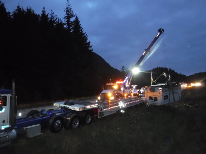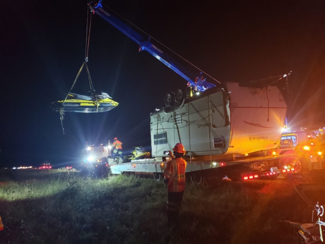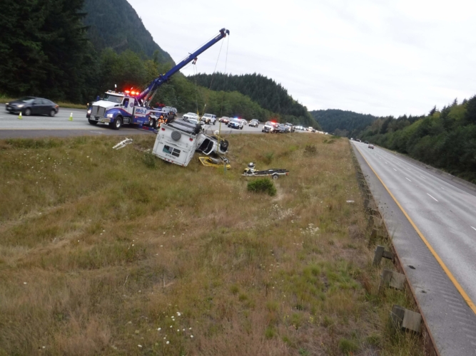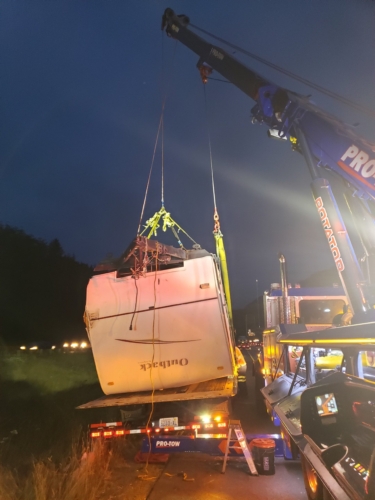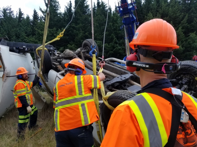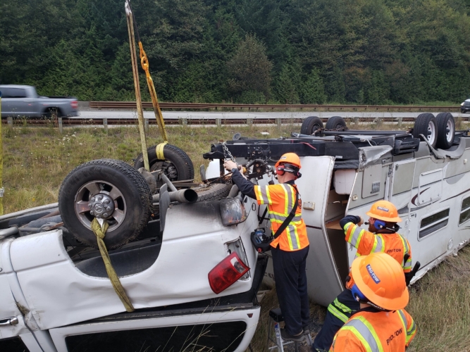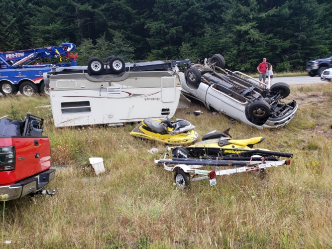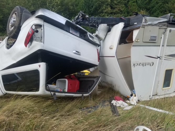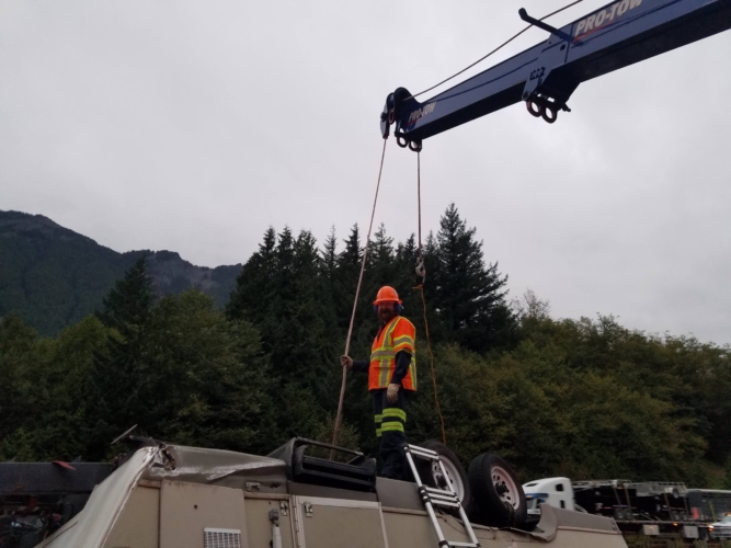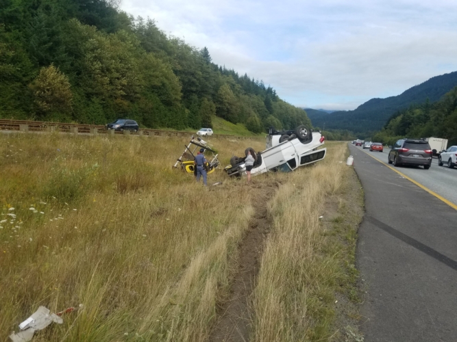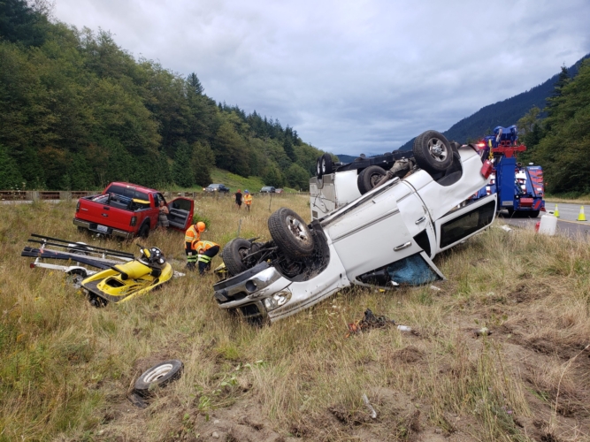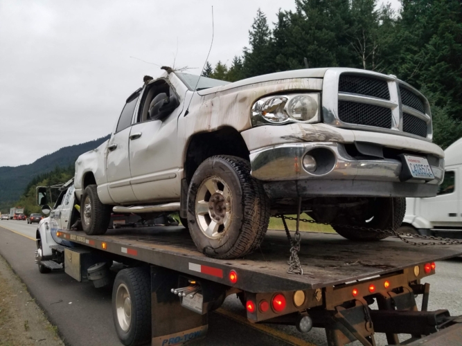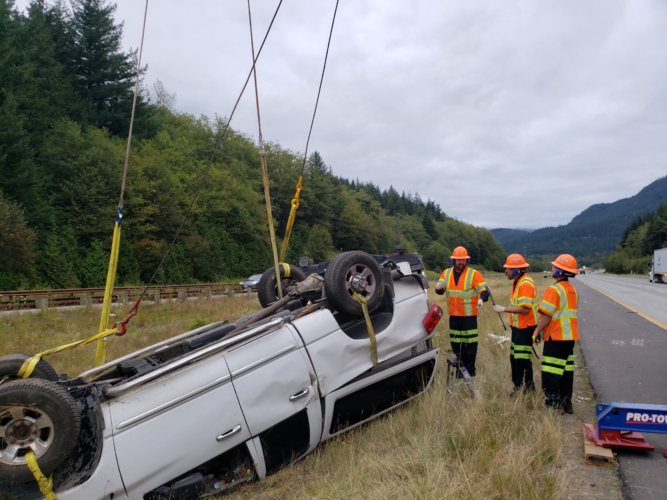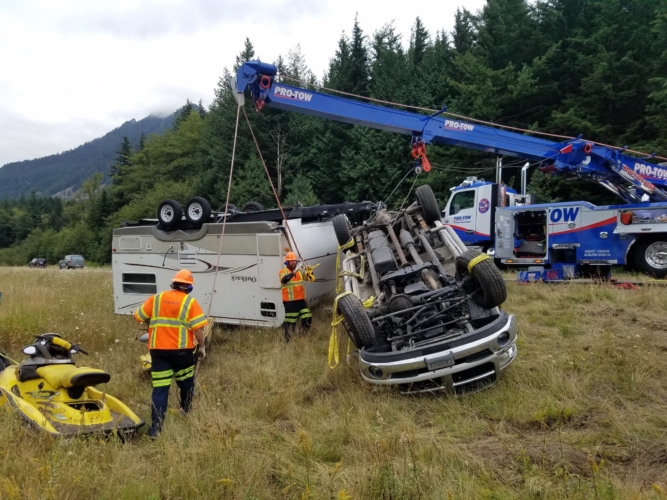 On August 30, 2019 Pro-Tow 24 Hour Towing responded to an emergency dispatch from the Washington State Police (WSP) and arrived on the scene to find a rolled over camper trailer, full-sized pickup truck and a trailer carrying two Sea-Doos. It was a full rollover collision at MM39 on the EB Interstate 90, east of North Bend, WA that required extensive truck accident recovery tactics to remediate.