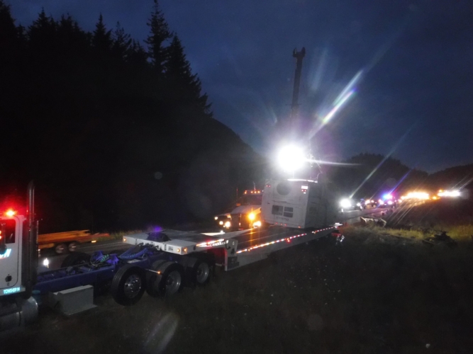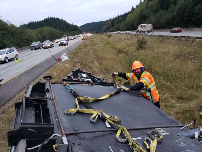 After a debrief from the WSP, we dispatched both a medium-duty wrecker and a heavy-duty crane-style wrecker, a light-duty flatbed tow truck and a heavy-duty tow truck complete with a Landoll trailer. Pro-Tow’s trained operators had to navigate traffic to assemble on the scene but were full equipped to tackle this truck accident recovery job.