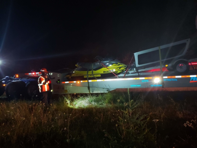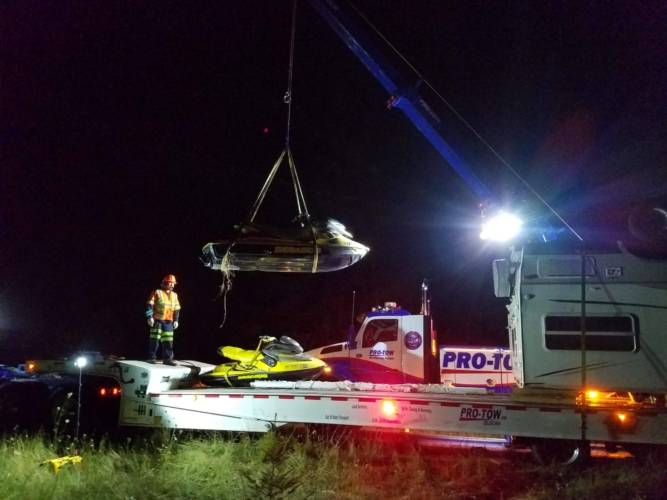 Next, the Sea-Doos. We recovered both Sea-Doos, the trailer they were on and various debris by lifting them onto the Landsoll trailer. Everything was strapped down appropriately to eliminate the risk of debris flying off the trailer during transport.